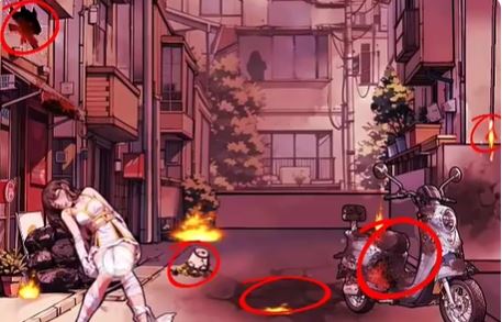 1、点击火坑、燃烧的电瓶车和右侧的电线。